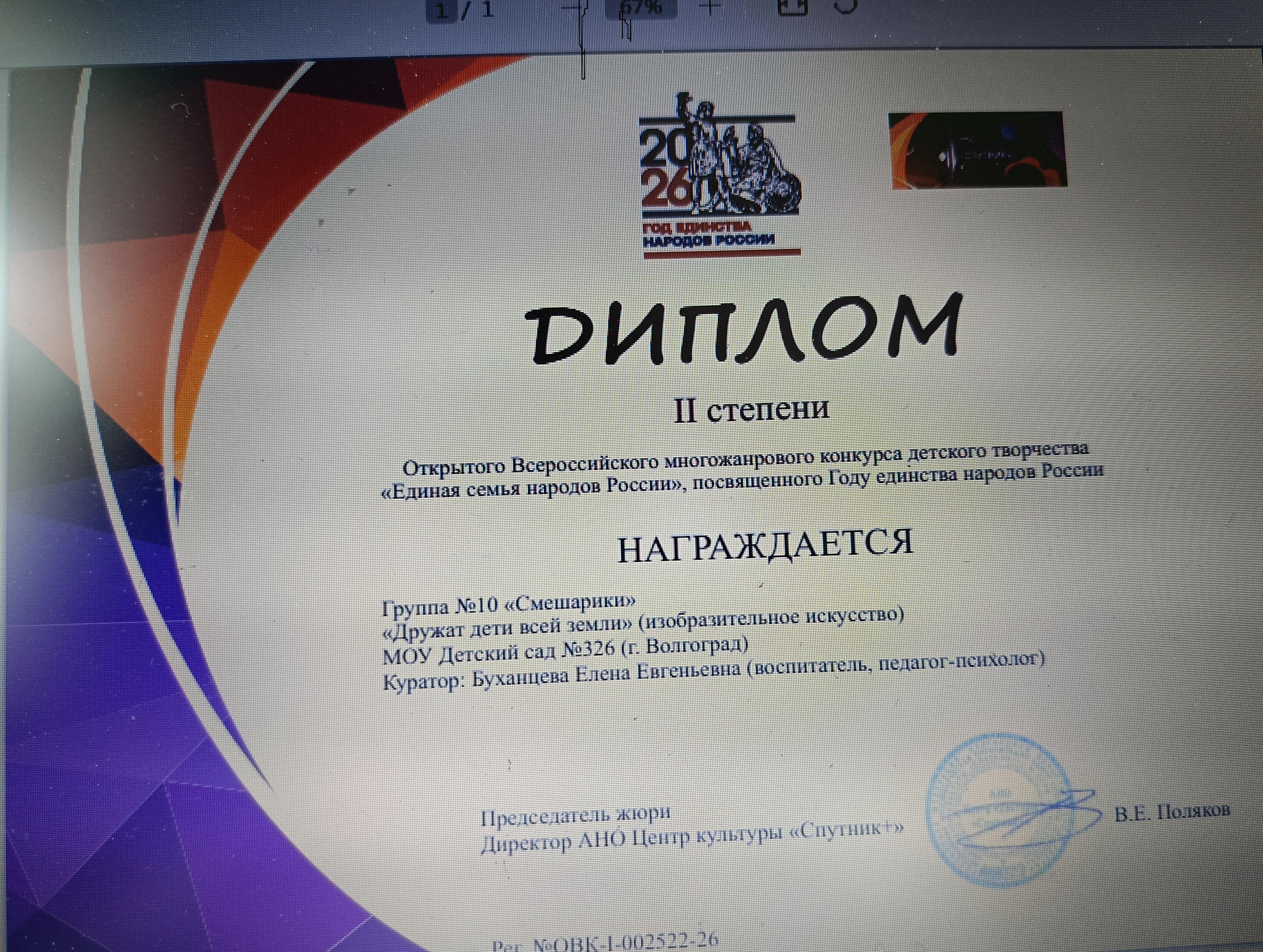 Воспитанники нашей группы приняли участие в конкурсе в рамках Года единства народов России, где представили коллективную работу "Дружат дети всей земли".